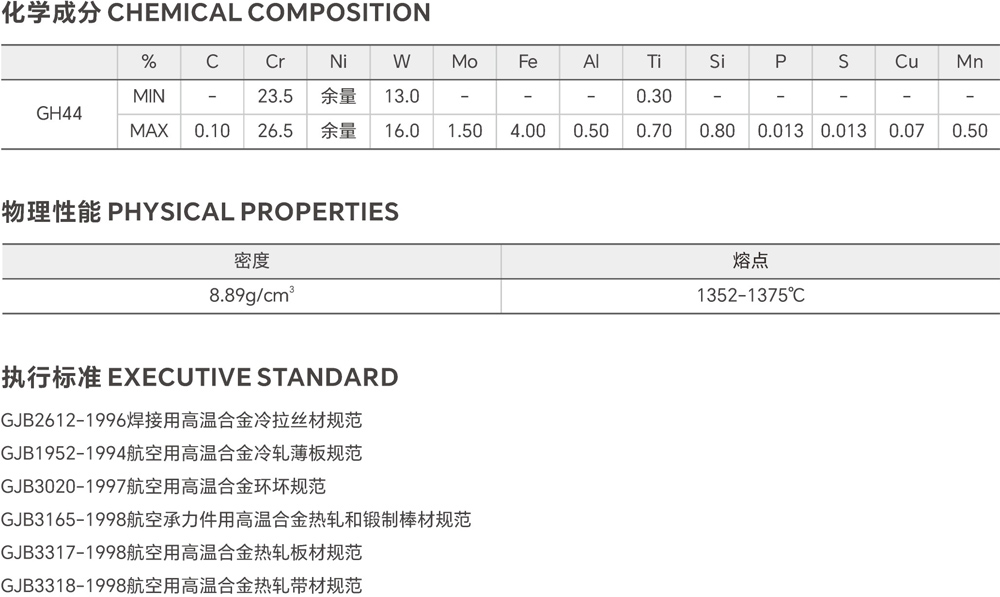 GH44 is a Ni-Cr based solid solution strengthened deformation superalloy with the service temperature below 900°C. It is suitable making the components for main combustion chamber and after burner of jet engine which work for a long time below 900°C. The alloy can be joined by arc welding, welding, seam welding and brazing, etc. And it can be welded with alloys such as 1Cr18Ni9Ti, GH1140 GH3030 and GH3039, etc. The parts working at high temperature can be protected effectively by using W-2 chrome plating.