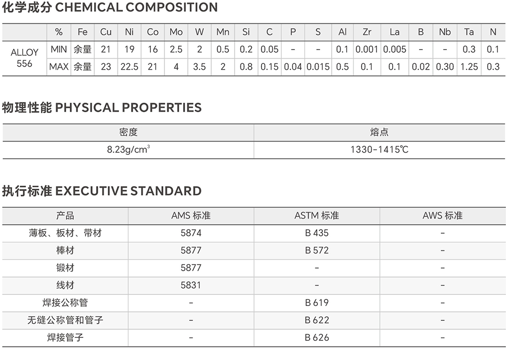ALLOY556 is a high strength alloy which is resistant to sulfidation, high temperature corrosion in a chlorine environment, and molten chlor, zinc, with excellent high temperature strength and good weldability is an excellent welding material for nickel or cobalt based alloys with iron based alloys.
