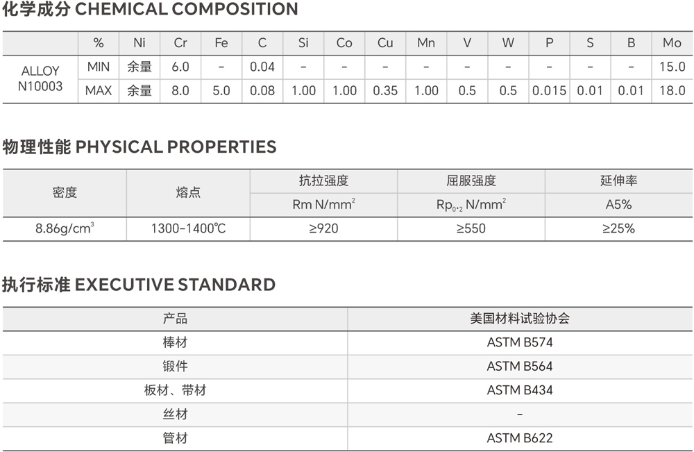 Alloy N10003 has good resistance to ageing embrittlement, and has good welding and machining performance, and has excellent to fluoride salt oxidation at 705-870°C.