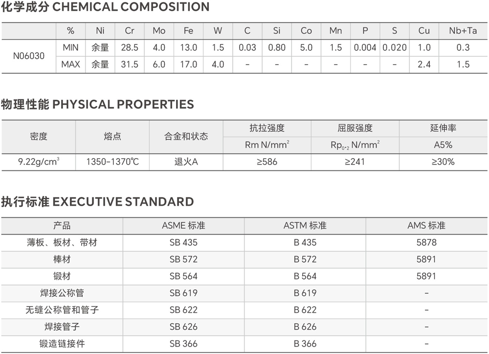 N06030 combines the strength of most superalloys with good thermal stability, oxidation resistance, thermal cycle resistance, machinability, and to grain growth at continuous high temperatures and a relatively low coefficient of thermal expansion.