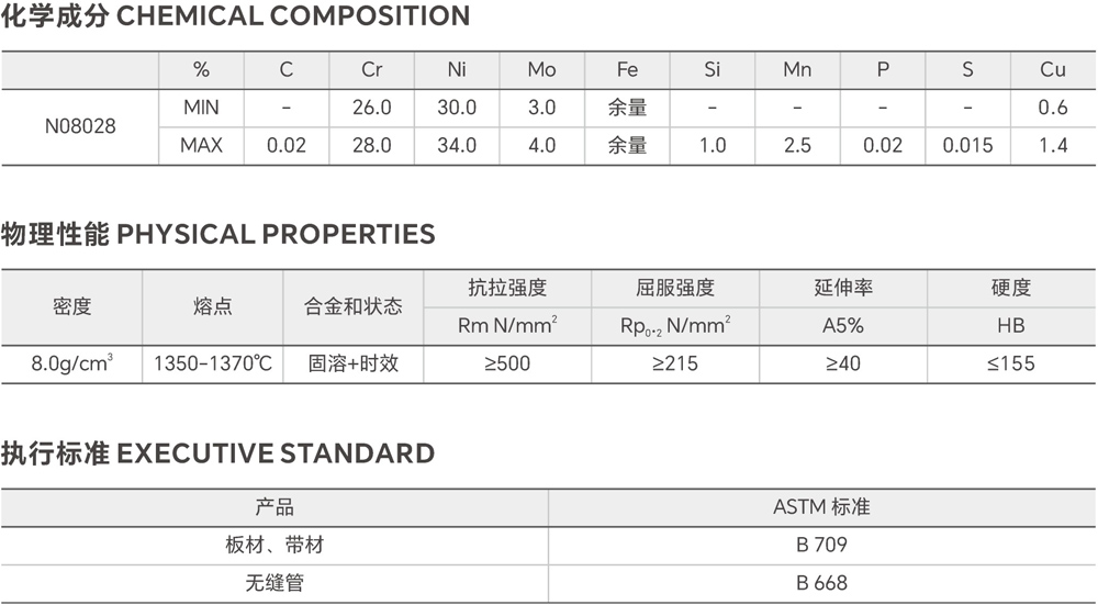 Excellent resistance to reducing or oxidizing acids, stress corrosion cracking, and to corrosion from the environment of use such as pitting and crevice corrosion. alloy has particular resistance to corrosion by sulfuric and phosphoric acids. For chemical processing, pollution control equipment, pipeline in oil and gas wells, nuclear fuel reprocessing, acid production pickling equipment.