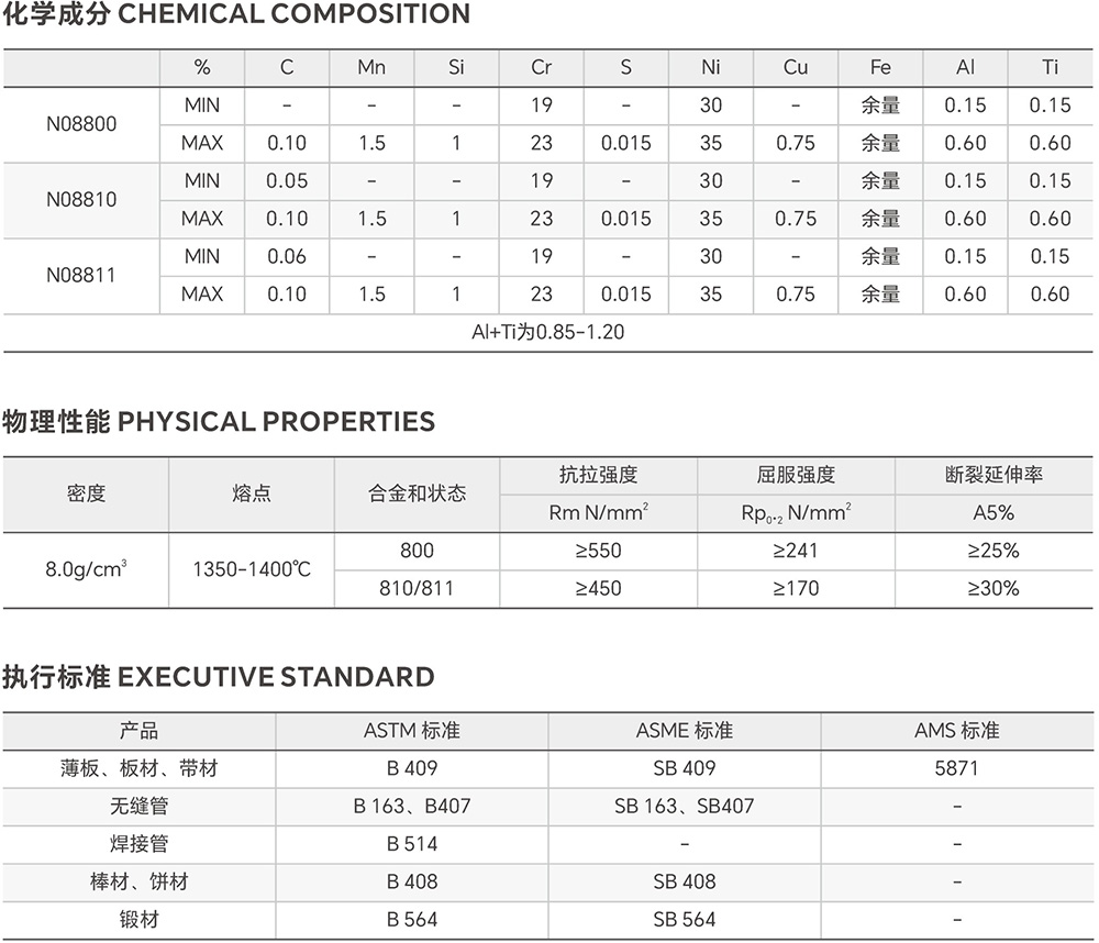 800: 1. Heating element tube - Good mechanical properties, 2. Acid pickling - Resistant to corrosion during processing. applications up to 600°C, the alloy is supplied in the annealed condition. For high-temperature applications, the alloy is supplied in the solution annealed condition 810: 1. Nitric acid condenser - Resistant to nitric acid corrosion. 2. Steam heating tube - Good mechanical properties. 3.ating element tube - Good mechanical properties. For applications up to 500°C, the alloy is supplied in the annealed condition.