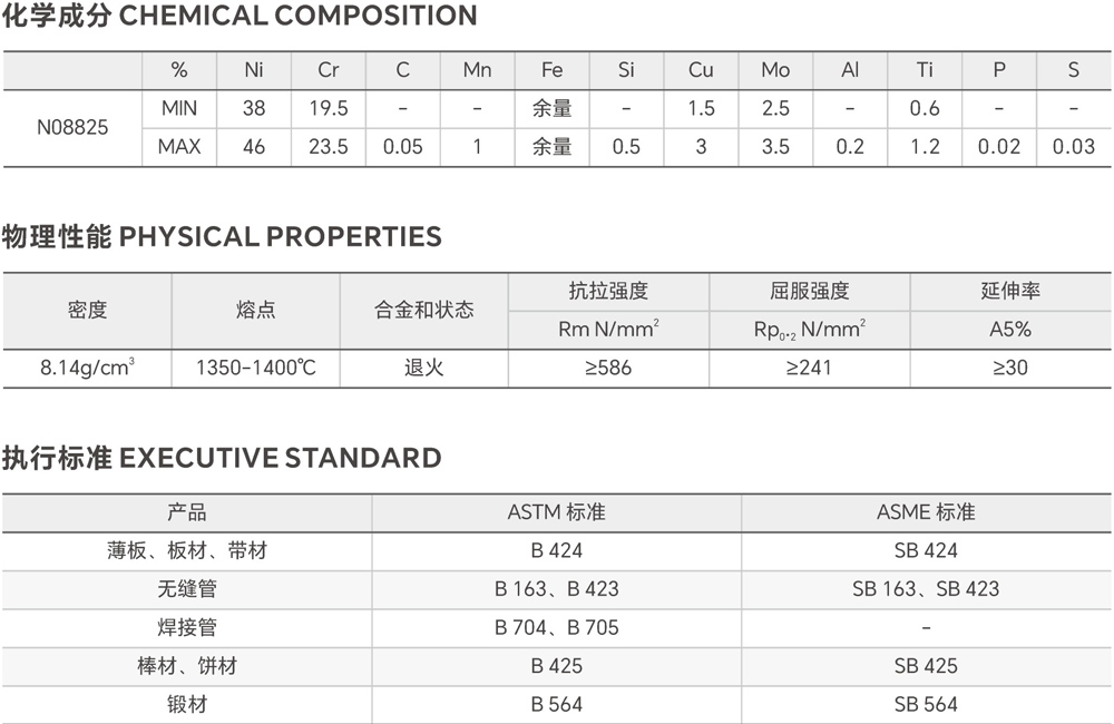 825 alloy is widely used in various industrial fields with a service temperature not exceeding 550°C.