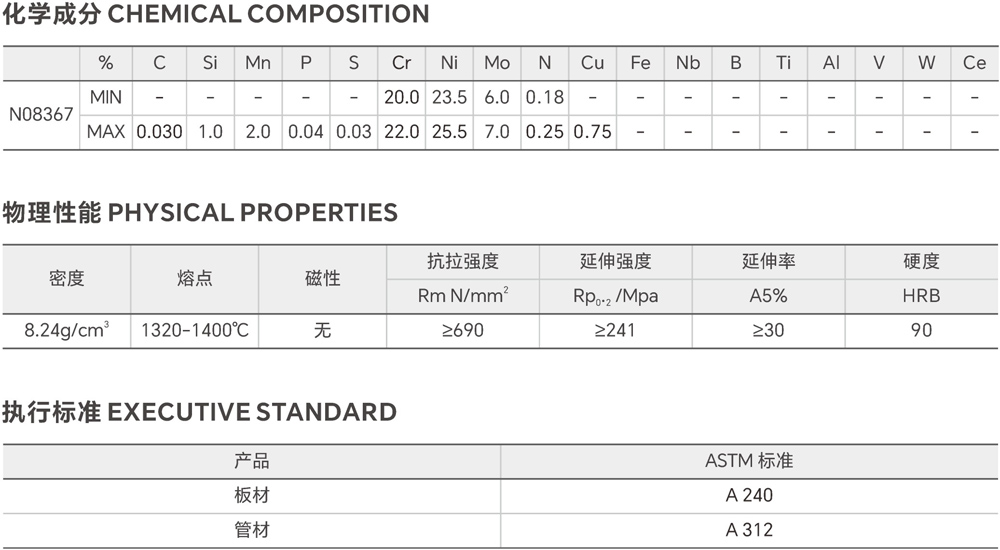 N08367 is a super austenitic stainless steel with excellent chloride ion pitting and crevice corrosion resistance. Its ability to chloride pitting, crevice corrosion, and stress corrosion is superior to that of 3 series stainless steels, and its cost is lower than that of corrosion-resistant nickelbased alloys. It exhibits good corrosion resistance in a variety of severe corrosive environments and is suitable for high chloride water solutions and chloride corrosion environments, and it also super strong corrosion resistance in harsh environments such as high-temperature seawater or flue gas desulfurization devices.