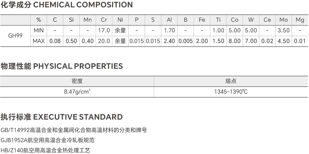 GH99 is a precipitation hardening type deformation superalloy with Ni-Cr base, which can be used for a long time below 00°C and the short-time highest working temperature can reach 1000°C. The GH99 alloy is strengthened by the solid solution of chromium,alt, tungsten and molybdenum elements, and the formation of aging strengthening phases by aluminum and titanium elements, and the purification and strengthening of grain boundaries boron, cerium and magnesium elements. GH99 alloys have high thermostrength, good stability of organization, and satisfactory process performance of cold and hot working forming and. GH99 is suitable for making high-temperature welded structural parts such as combustion chambers and afterburners of aircraft engines. The main products of GH99 are hotrolled bars, plates, wires and forgings. The large plate structure parts manufactured by this alloy can be used directly without aging treatment after solid solution treatment. No harmful phases were found the alloys after long-term aging at 700°C ~ 950°C.