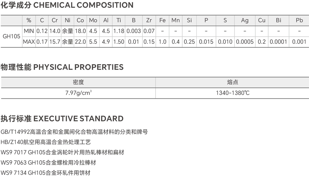 GH105 is a Ni-Co-Cr based deposition hardening type deformable high temperature alloy, which is used at 750°C-950°C. The alloy has high room temperature and high temperature strength, excellent oxidation resistance, but the thermal processing performance and welding performance are general. It is suitable for manufacturing turbine blades, high temperature bolts and other high temperature parts of aircraft engines. The main products are hot rolled bars and flat bars, cold drawn bars, profiles and rings, etc.