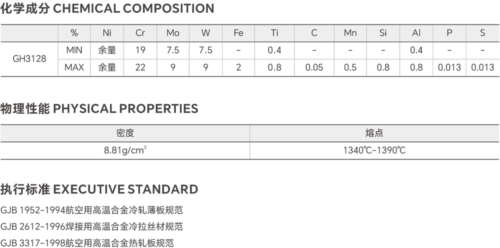 High-temperature alloy (GH3128), a solution-strengthened nickel-based alloy, possesses excellent comprehensive properties and high durability, featuring higtility, high sustained creep strength, as well as good oxidation resistance and formability and weldability.