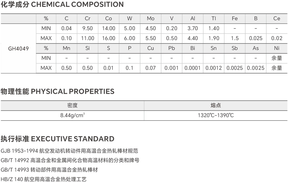 GH4049 is a Ni-Co-Cr-based precipitation-hardening wrought superalloy with a service temperature below 950°C. The alloy possesses good oxidation resitance below 1000°C and high high-temperature strength below 950°C. It is suitable for manufacturing gas turbine working blades operating at temperatures ben 850°C and 950°C. Major products include hot-rolled and forged bars, and die-forged turbine blades. Compared with nickel-based alloys of similar application, ths relatively poor hot workability; however, its workability can be improved through electroslag remelting or vacuum arc remelting, and the impact tougness at 1000°C-1170°C is increased by 1 to 3 times.